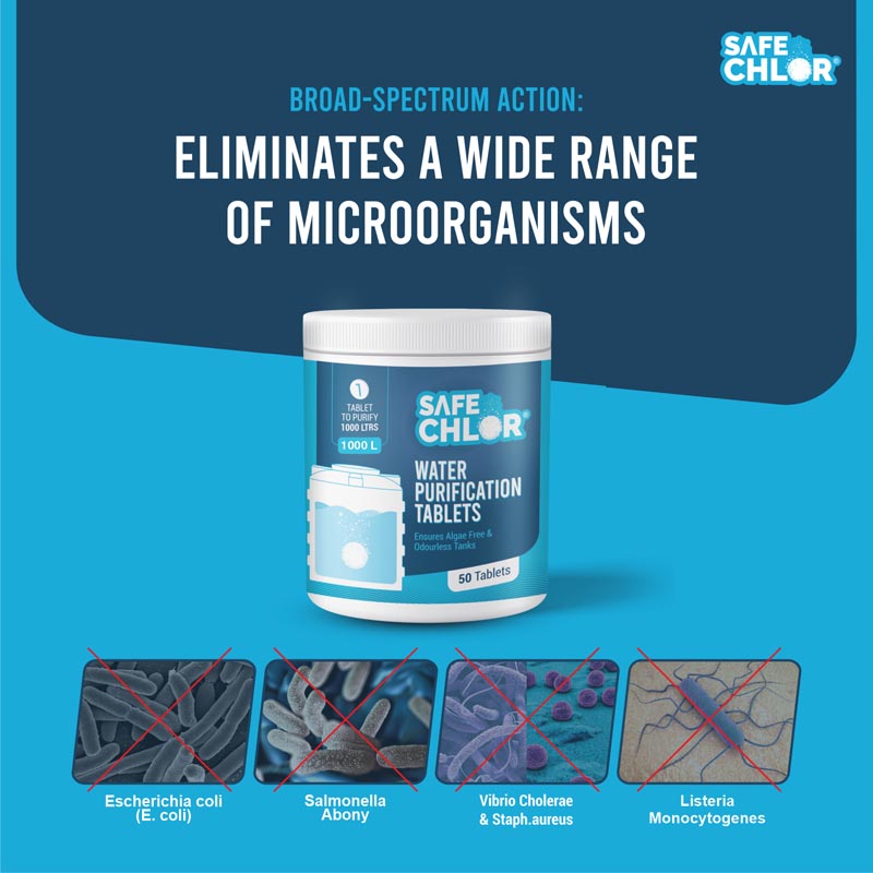 Add 1 tablet per 1000 liters water tank/sump -